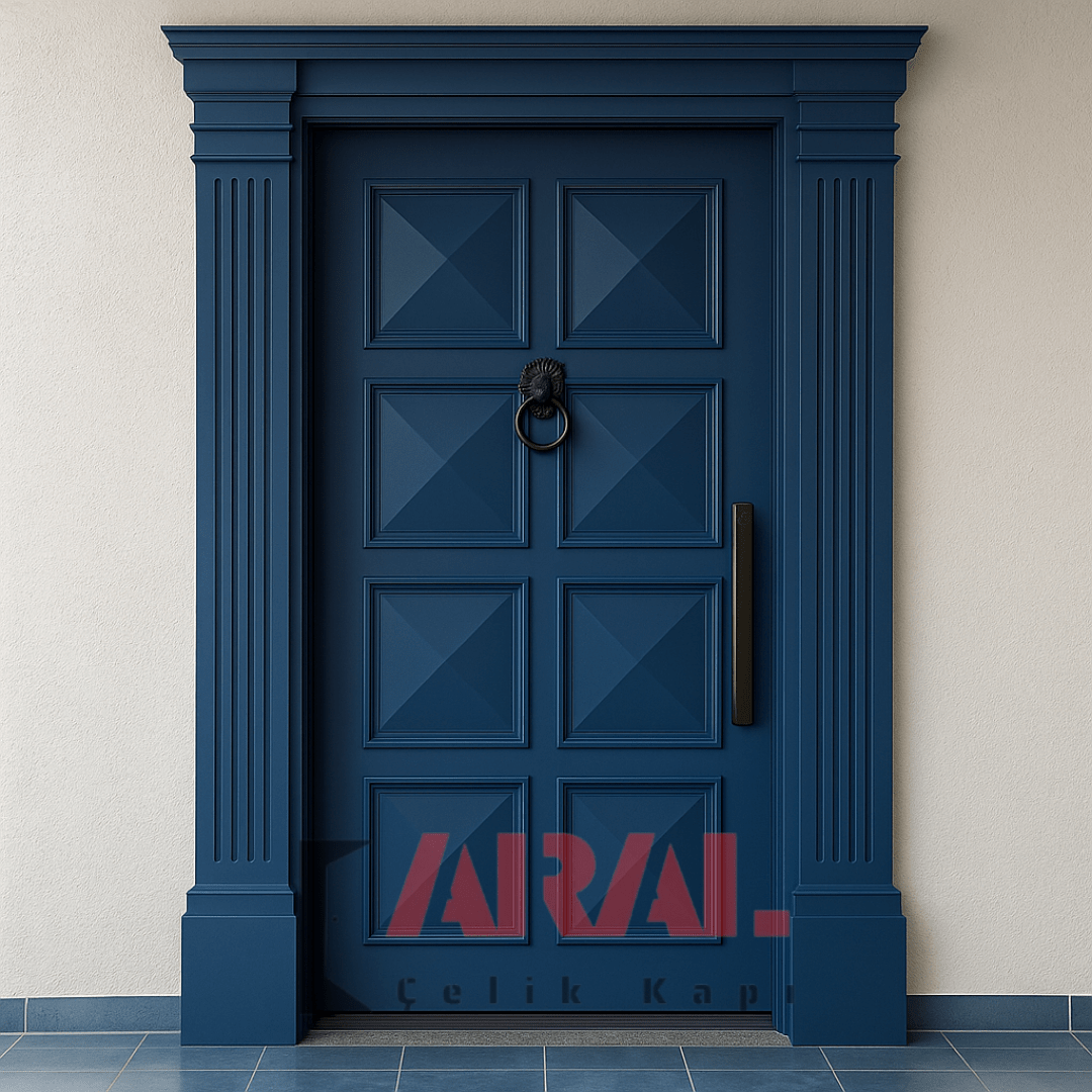 AR1096 A+ Seri Mavi Çelik Kapı, Aral Çelik Kapı kalitesiyle üretilmiş; modern mimariyi güçlü güvenlik detaylarıyla birleştiren özel bir modeldir. Mavi rengin sofistike duruşu, 8 adet kare göbek kabartma tasarımı ve siyah aksesuarların net çizgisiyle AR1096, A+ Seri Çelik Kapı kategorisinde modern stil arayan kullanıcıların öncelikli tercihlerinden biridir.