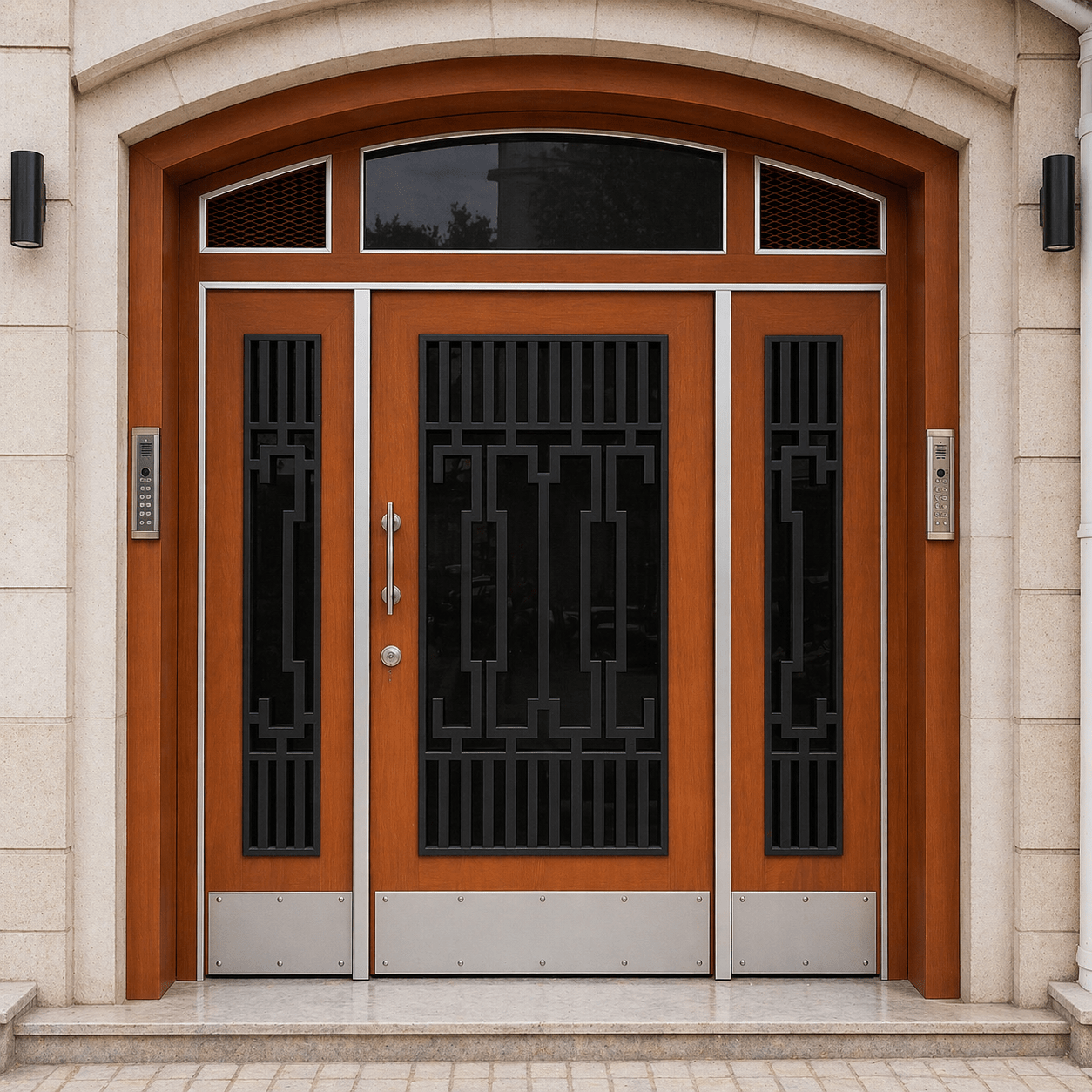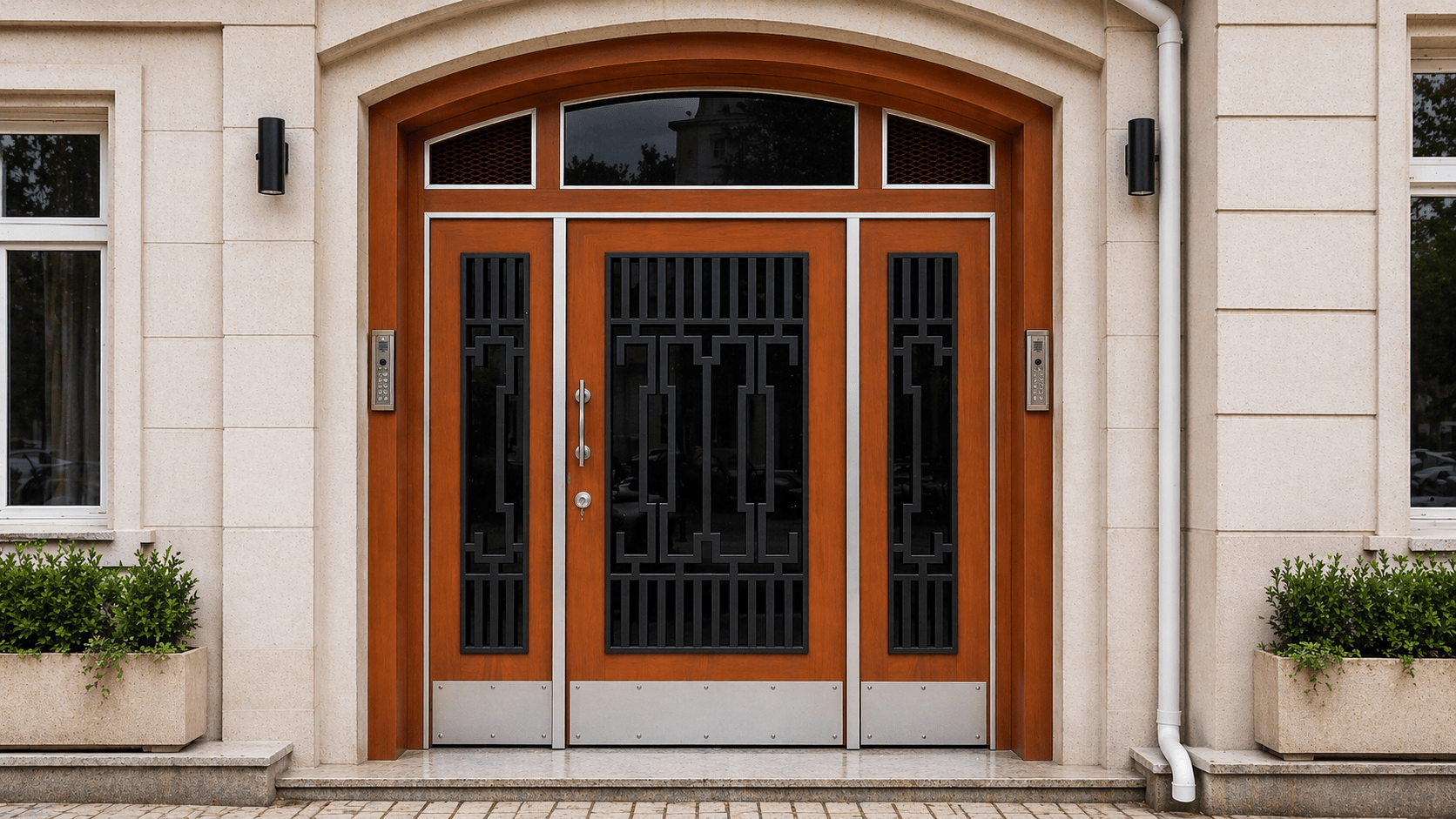 AR4001 apartman giriş kapısı, doğal ahşap görünümlü yüzeyi, modern çizgileri ve güçlü çelik yapısı ile apartman ve site girişlerinde estetik ile güvenliği bir araya getirir. Geniş cam alanları ve ferforje detayları sayesinde hem şık hem de dikkat çekici bir giriş sağlar.
