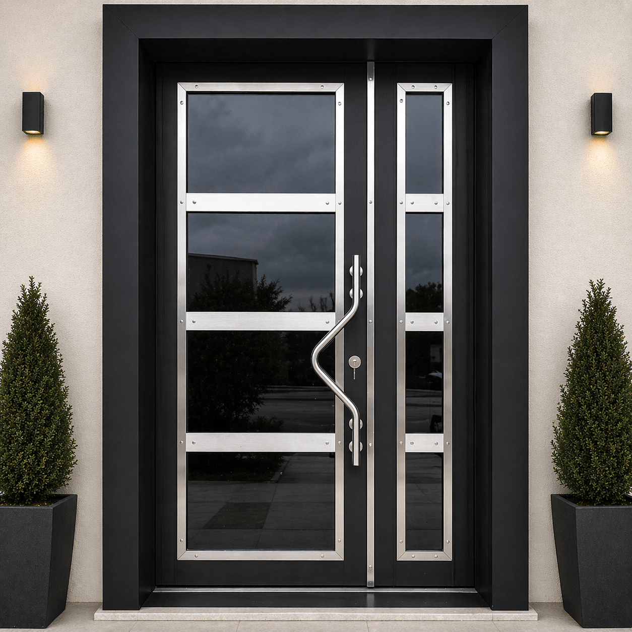 AR4003 apartman giriş kapısı, modern çizgileri, geniş cam detayları ve sağlam çelik yapısı ile apartman ve site girişlerinde estetik ile güvenliği bir araya getirir. Minimal ve dengeli tasarımı sayesinde her bina mimarisiyle uyum sağlar.